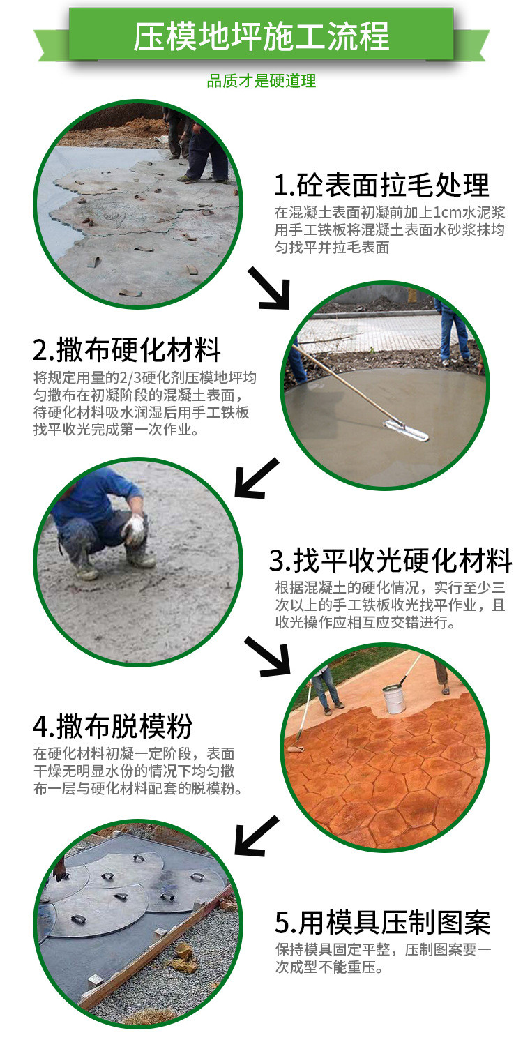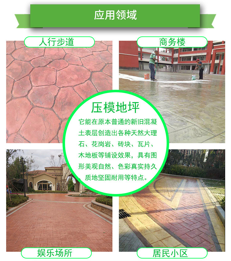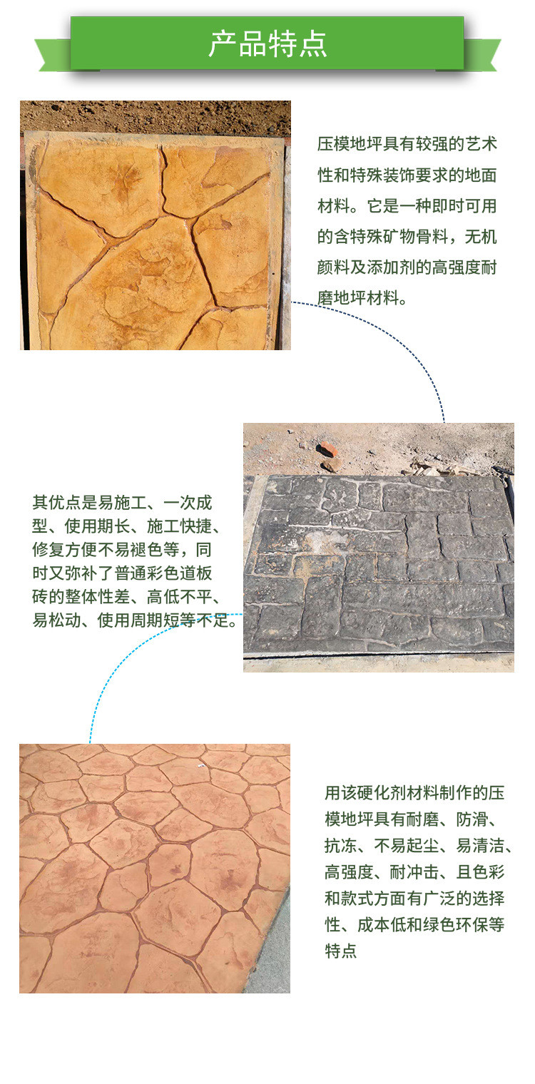 抗压强度一般可达普通混凝土的3倍,抗渗性好;提高耐磨性,防尘;使用无机颜料,色泽牢固持久,耐紫外线;  增强磨擦系数一一光亮但不打滑;防油、防水、防滑,表面不易开裂、脱落、褪色;造型美观、大方,绿色环保,使用较为广泛。
