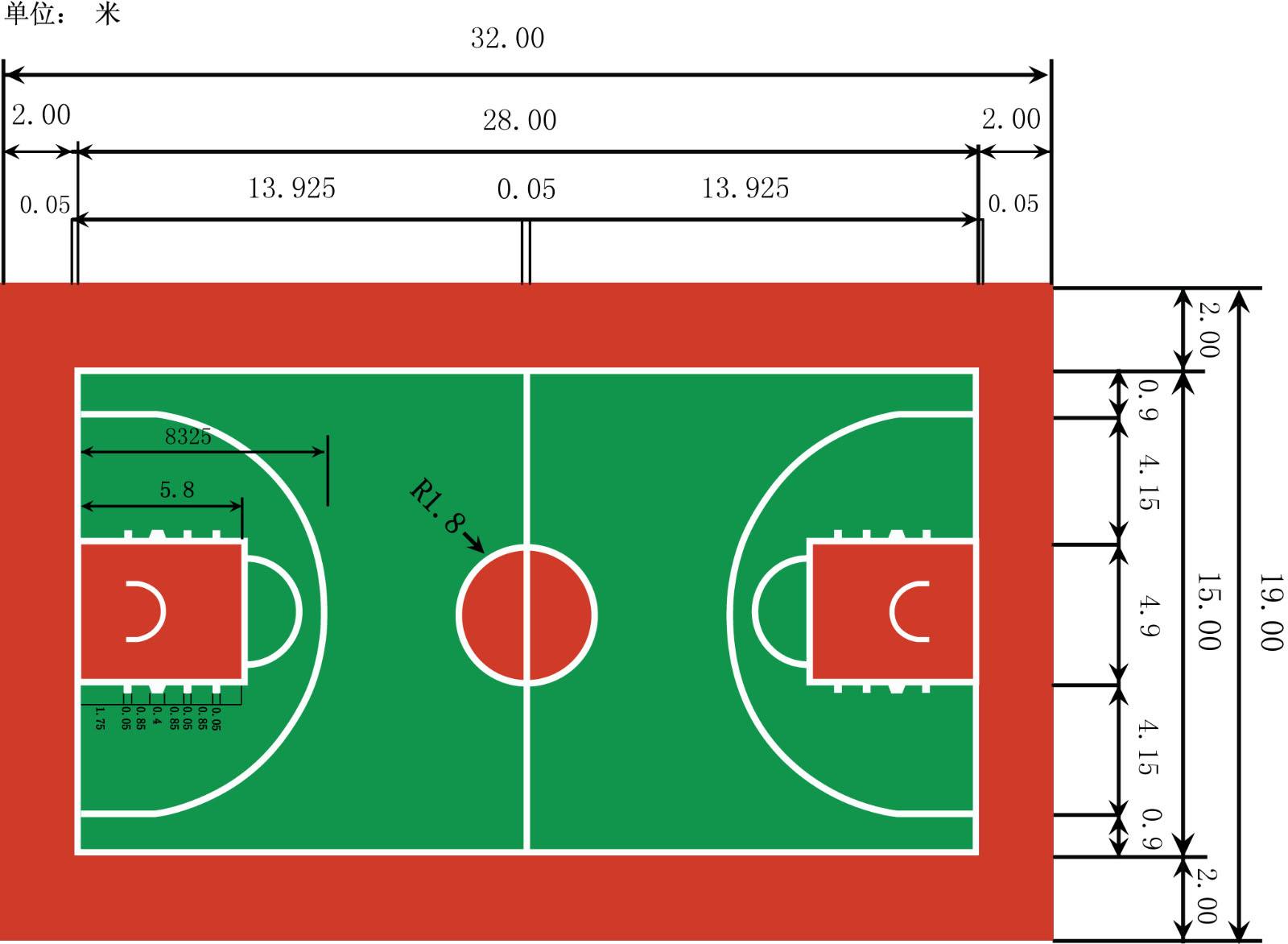 标准篮球场地为长32米,宽19米的长方形平地。比赛区长28米,宽15米,球场有明显的界线。
