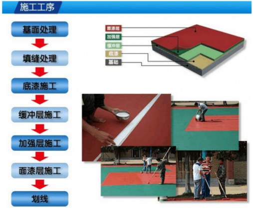 3、待施工基层干燥后用滚筒将单组份乳液混合料将材料均匀地刮涂在水泥混凝土基面上,起到封闭水泥基面的隙孔,提高塑胶层与水泥基面的粘结强度的作用,使之不易脱层和产生气泡。如有部分地面吸料较明显的要重复滚涂一至两遍。待底漆层干固后,再进行下一道工序施工。