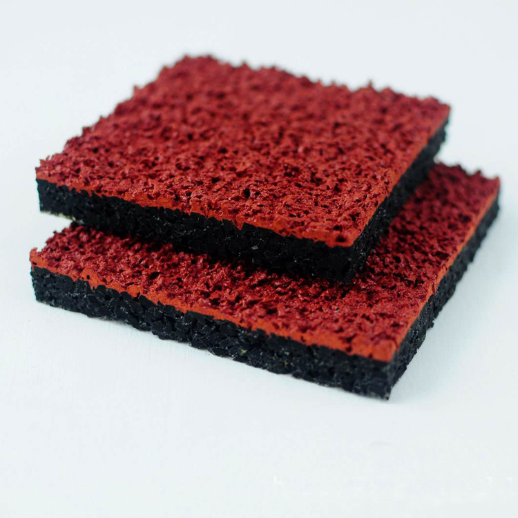 1、 面层采用EPDM(三元乙丙)胶粒,使之具有高度紫外线抵抗力,实践证明,无褪色,强力耐磨。