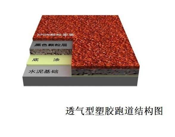 透气型塑胶跑道底层是采用单液型PU与弹性橡胶颗粒相结合,为环保型产品,具有透气功能。在高温下,地基产生的蒸汽,会很快的散发出去。蒸汽压力无法聚集,所以不会产生鼓泡现象,并符合专业要求,弹性好。