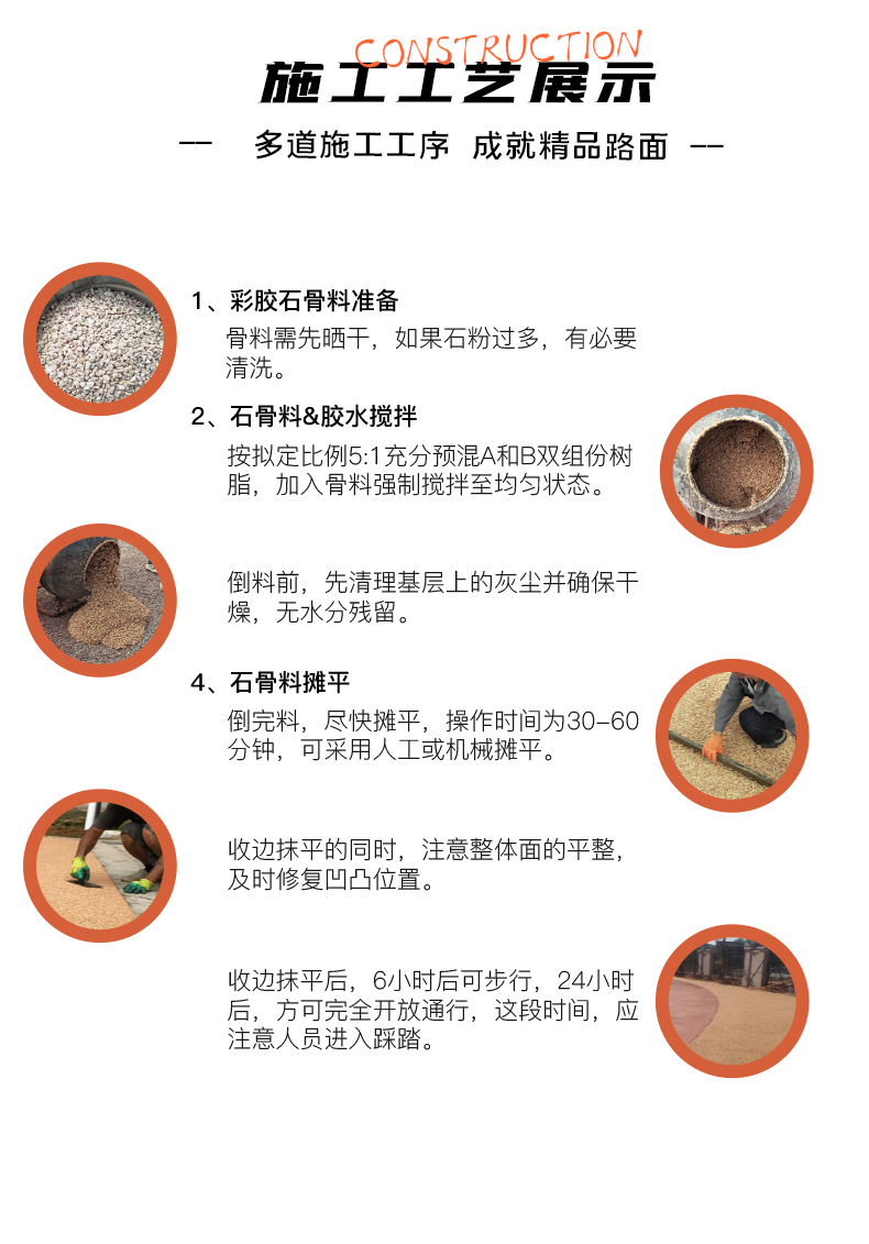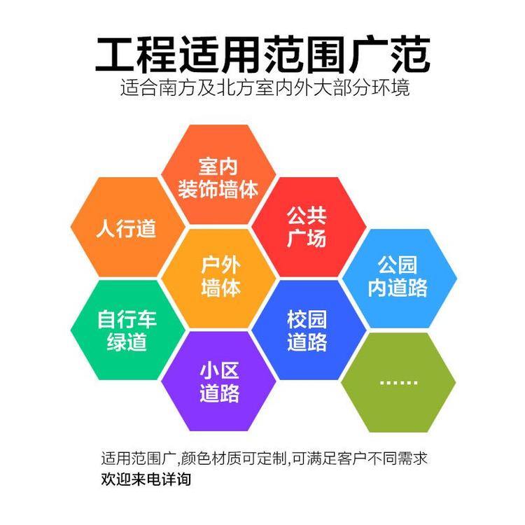 近年来彩色路面的铺装选材款式多样,每一种材料都会有自己独特的施工方法,通过专业的施工后呈现出各具特色、功能和美观的彩色地坪。彩色胶筑彩色胶粘石因其是由天然水洗打磨后的彩色石子和高强度耐黄变的改性聚氨酯树脂经特殊工艺制作而成。既能展现彩色石子原有的天然色泽,还有生态透水、透气、防滑的特点,是一种会呼吸的生态地面,形成一种Gao级感十足的装饰地坪路面。具有美观、透水性能高、承载力强、散热性好,协助构筑温和、舒适、健康的生活环境。彩色胶粘石地坪广泛用于市政步道、园林小路、绿道树洞、城市广场、Gao档住宅小区、商务办公大楼、户外运动场所。