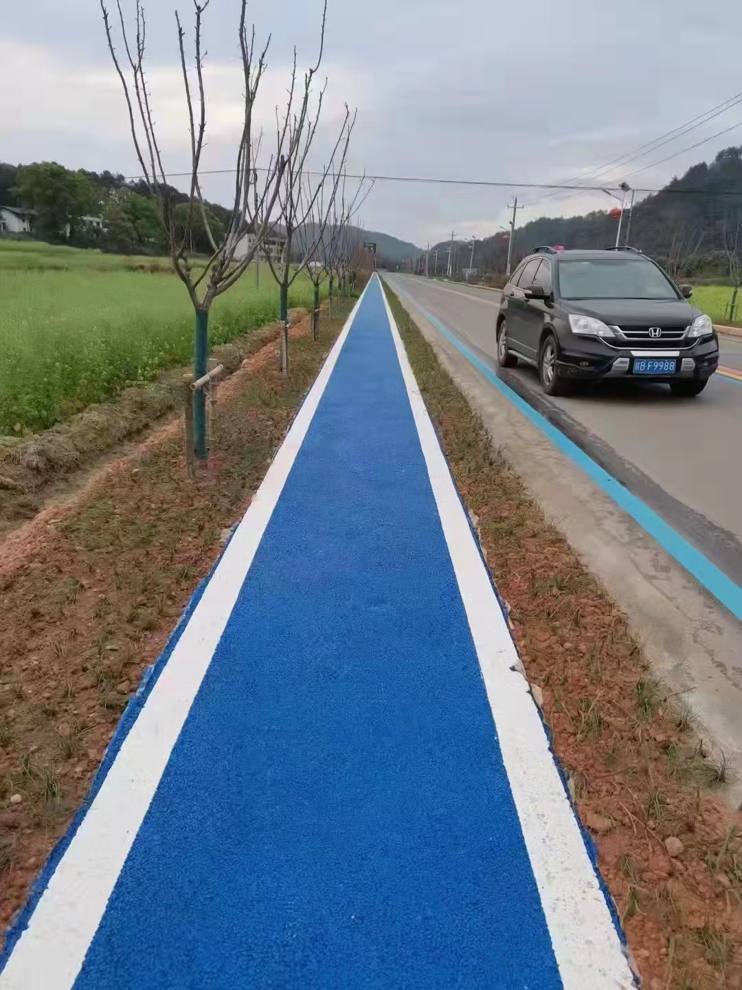 这次黄埔大沙地护林路到天河区中山大道段透水地坪绿道的铺装主要材料使用的是广东大来透水混凝土和冷铺型高粘透水沥青材料,其组合结构是底层铺装透水混凝土,面层是冷铺型高粘透水沥青材料,颜色选择的是蓝色,十分具有时代色彩。