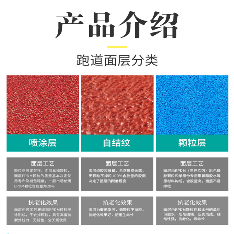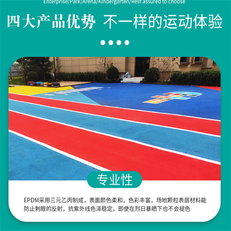 那什么是三元乙丙橡胶呢?其实就是乙烯、丙烯和少量的非共轭二烯烃的共聚物。主链的组成是稳定的饱和烃,侧链含有不饱和酸降,其优点很多,耐热、耐臭氧、耐老化等性能卓越,一般学校跑道、游乐场和体育项目运动场地基本上都是这种材料,此材料具有耐磨、舒适、高弹、防滑等特点。
