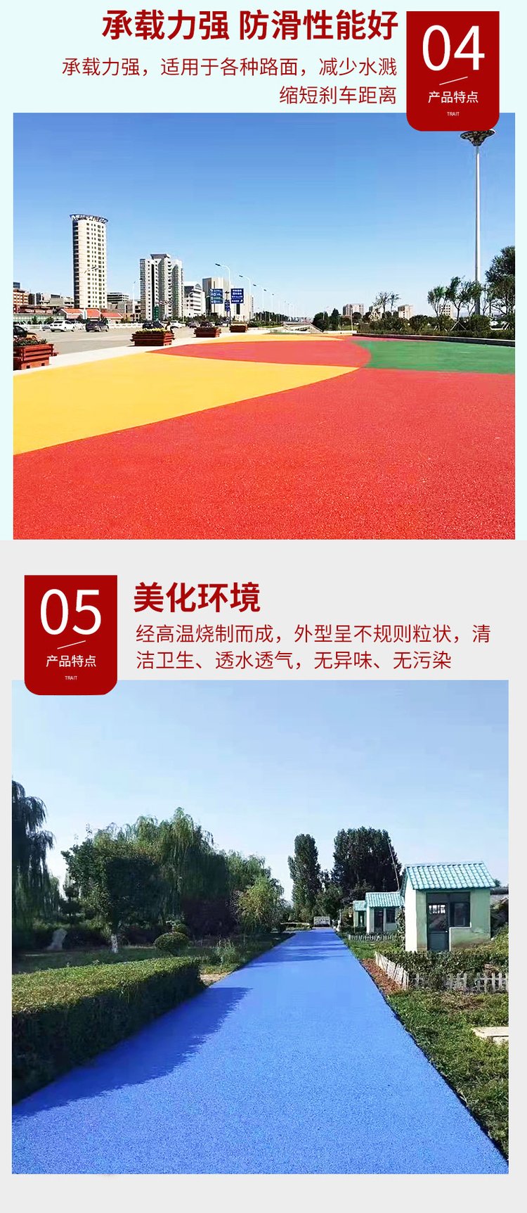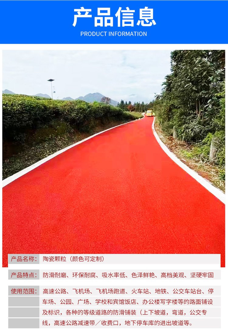 目前传统的沥青路面在刚铺设完成后短期内的防滑性能也非常好,但是经过一段时间的摩擦损耗后,路面表面结构深度就会变小,这样就大大的降低了防滑性能,而陶瓷颗粒防滑路面的特性就是不掉砂,使用一段时间之后也不会降低路面的防滑性能,所以对提升路面行车安全有很大的效果。