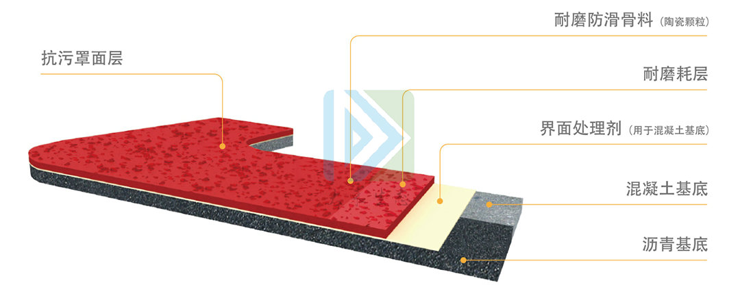1、骨料层。2、高性能胶合剂层。3、原始砼、沥青、金属、木材层