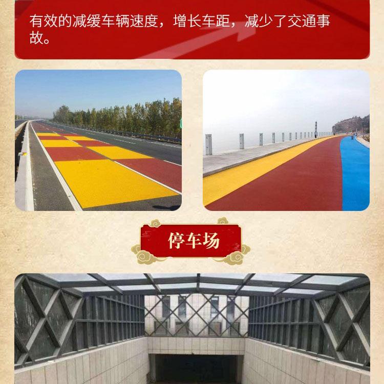 彩色防滑路面增加地面与轮胎之间摩擦的同时降低了车道对汽车轮胎的损伤,不滑不趁,融雪美观、减少了车辆轮胎与车道间磨擦的澡音,降低了普通车道对汽车和汽车轮胎的损伤,阻尼性能,起伏性低。 彩色防滑陶瓷颗粒,采用水尼基材料所以该车道/路 有超长寿命;表面用自热树脂封闭,耐候性特强、具有自洁性;抗重压、耐磨损、易施工.