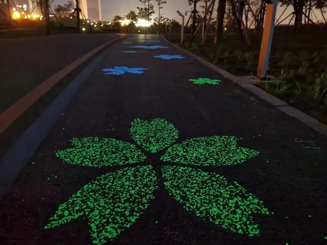 胶粘石地面是由改性高分子树脂为胶结材料,将天然彩石、抛光色石、玻璃、水晶石、人造再生骨料等牢固地粘接在一起,铺设在混凝土、透水混凝土、沥青或级配砂石基层上的生态景观地面铺设材料。荧光石点撒胶粘石地坪,双剑合璧,美观无敌。下面小编就讲讲荧光石点撒胶粘石地坪做法。