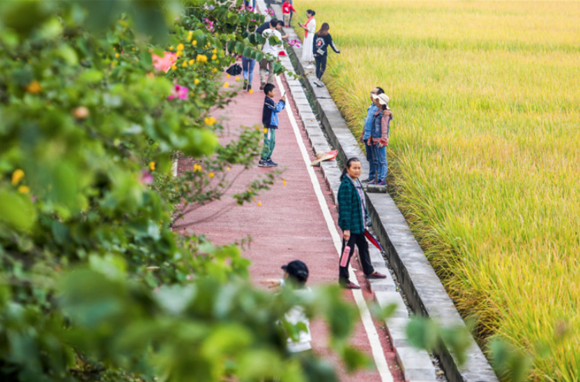 稻田四周的步道均采用新型透气环保透水混凝土铺装方式摊铺,防滑、透水,干净舒适的环境一改农村湿滑田埂路影像,特别适合亲子游玩。